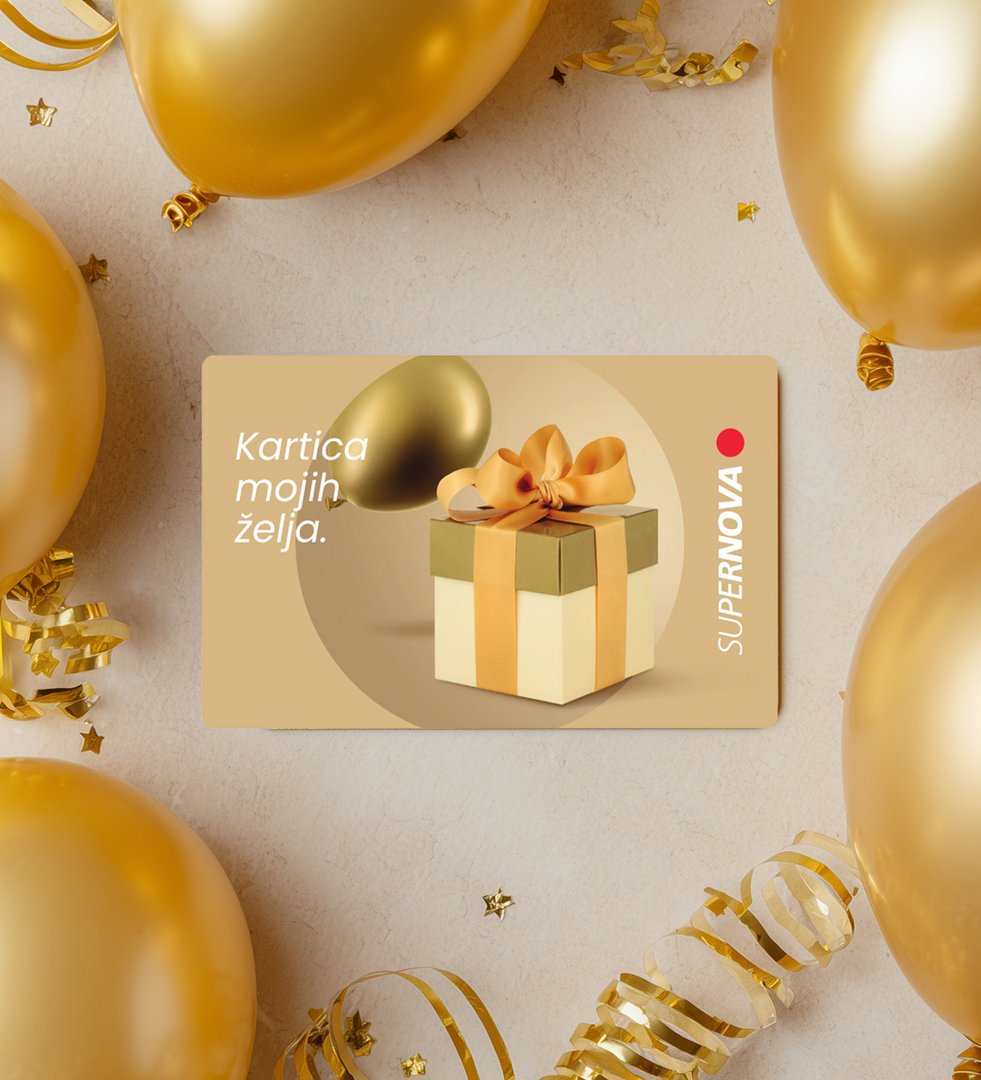 Darilna kartica Supernova je vrhunsko darilo za vsako priložnost – pa naj bo le majhno presenečenje ali čudovito praznovanje pomembnega mejnika v življenju. Izberi enega od privlačnih motivov, naloži poljubno vrednost, od 10 do 300 €, in podari veselje brezskrbnega nakupovanja v več kot 700 trgovinah in lokalih v nakupovalnih centrih Supernova po Sloveniji.